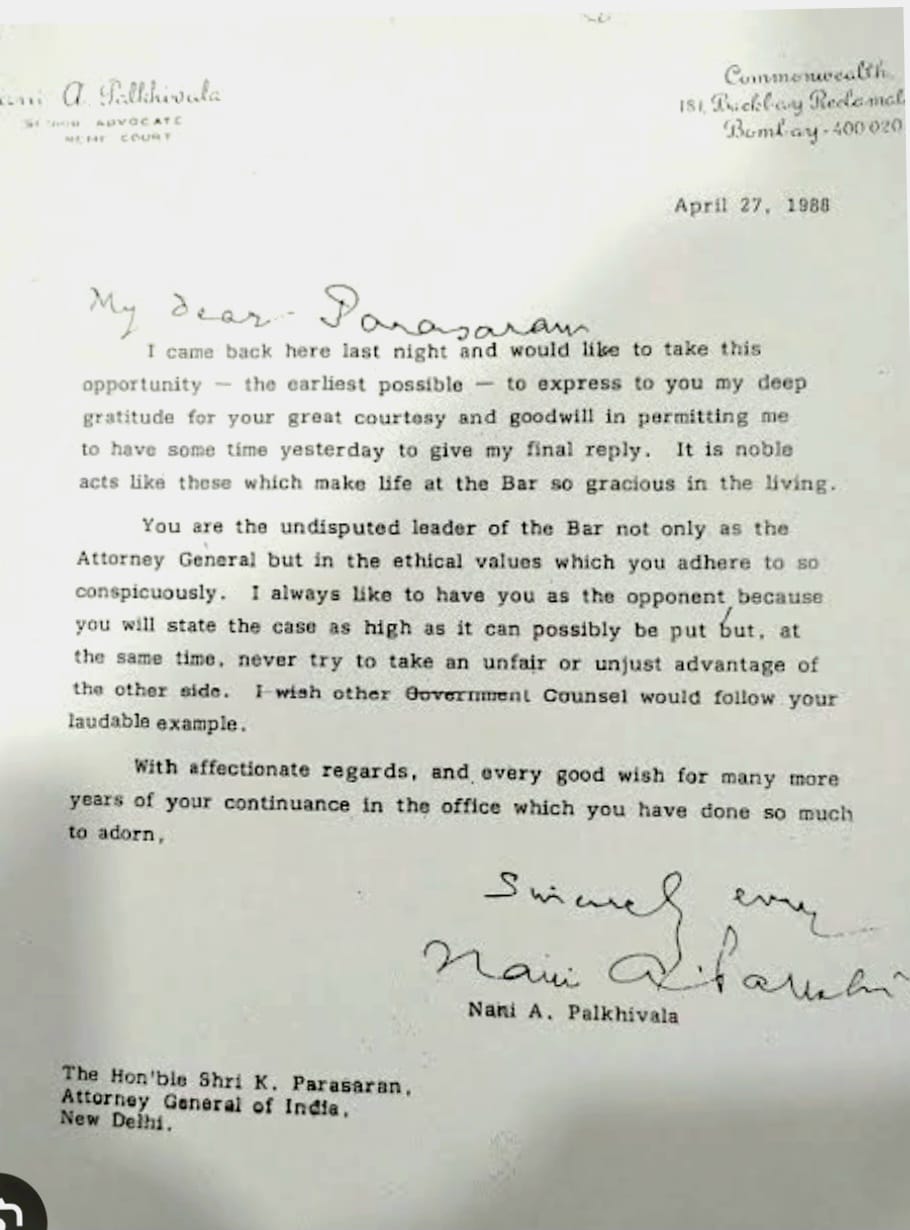 Mr. Nani A Palkhivala to Shri. K Parasaran AG